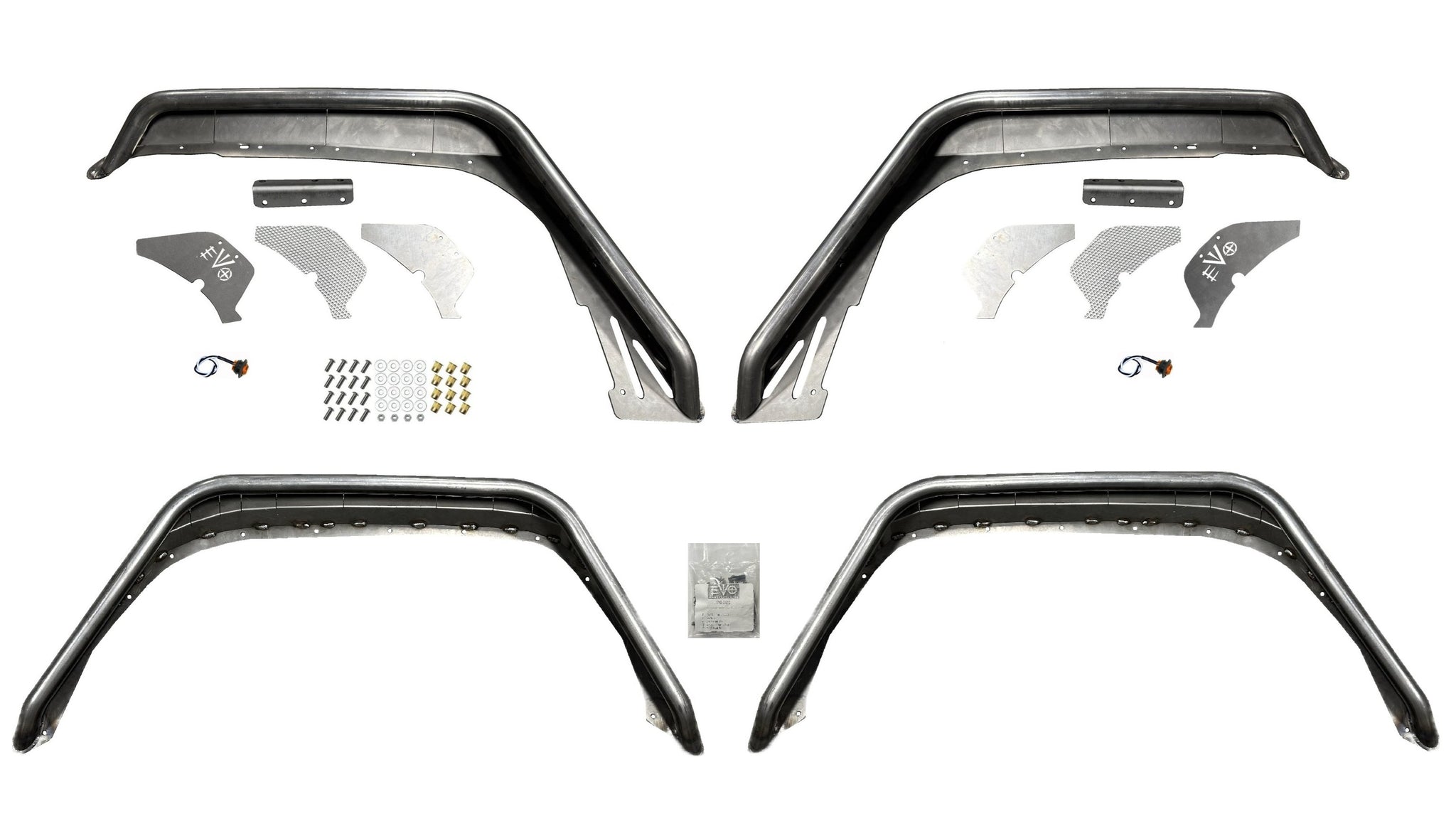 The EVO MFG KSPEC Highline Tube Fenders give a clean finished look to your JT while raising and widening the fender openings. Keeping with the bodylines, the tubing is fully rolled with virtually no straight sections to accurately follow the body fender depression, giving a seamless and finished appearance. No bump bending or offset plate transitions. Just clean flowing bodylines. 3.5" wide from the body for tire coverage. Larger wheel opening gives increased tire clearance for larger tires and lower lift requirements. The bottom of the fenders are 3.25" higher than stock Rubicon flares and 5" higher than stock sport flares. Able to fit 40s with 2.5" lift. Yep.